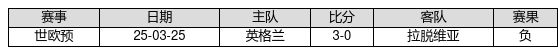 拉脱维亚 VS 英格兰两队近10年的交战次数为1场,拉脱维亚0胜0平1负,赢球概率为0.0%,平局概率为0.0%,输球概率为100.0%。