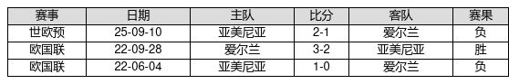 爱尔兰 VS 亚美尼亚两队近10年的交战次数为3场,爱尔兰1胜0平2负,赢球概率为33.3%,平局概率为0.0%,输球概率为66.7%。