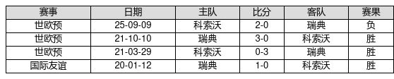 瑞典 VS 科索沃两队近10年的交战次数为4场,瑞典3胜0平1负,赢球概率为75.0%,平局概率为0.0%,输球概率为25.0%。