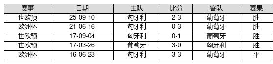 葡萄牙 VS 匈牙利两队近10年的交战次数为5场,葡萄牙4胜1平0负,赢球概率为80.0%,平局概率为20.0%,输球概率为0.0%。