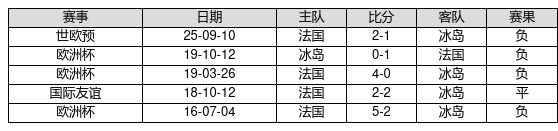 冰岛 VS 法国两队近10年的交战次数为5场,冰岛0胜1平4负,赢球概率为0.0%,平局概率为20.0%,输球概率为80.0%。