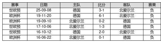 北爱尔兰 VS 德国两队近10年的交战次数为6场,北爱尔兰0胜0平6负,赢球概率为0.0%,平局概率为0.0%,输球概率为100.0%。